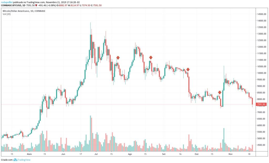 Rudá Pellini, fundador da fintech Wise & Trust nos EUA, avalia que desde setembro há grandes desvalorizações do Bitcoin que coincidem com os dias 21-22 de cada mês, indicando que essas baixas possam ser causadas por investidores que derrubam os preços por meio de vendas em bloco no mercado à vista para conseguirem exercer os contratos futuros.